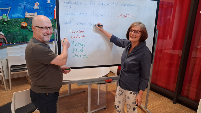 Mittlerweile leitet Martina Sprenger das Sprachcafé zusammen mit Yüksel Hiz. Zweimal in der Woche treffen sich hier zwischen 20 und 30 Frauen und Männer, die aus verschiedenen Ländern nach Deutschland geflüchtet sind und nun in Wichlinghausen leben. Yüksel Hiz war in der Türkei Jurist. Vor mehr als acht Jahren kam er nach Deutschland – ohne Sprachkenntnisse, voller Unsicherheit. „Ich sage den Menschen im Sprachcafé immer: Habt keine Angst vor Fehlern. Sprecht so oft wie möglich Deutsch, auch draußen. So lernt man nicht nur die Sprache, sondern auch die Kultur kennen.“