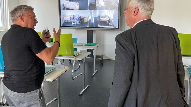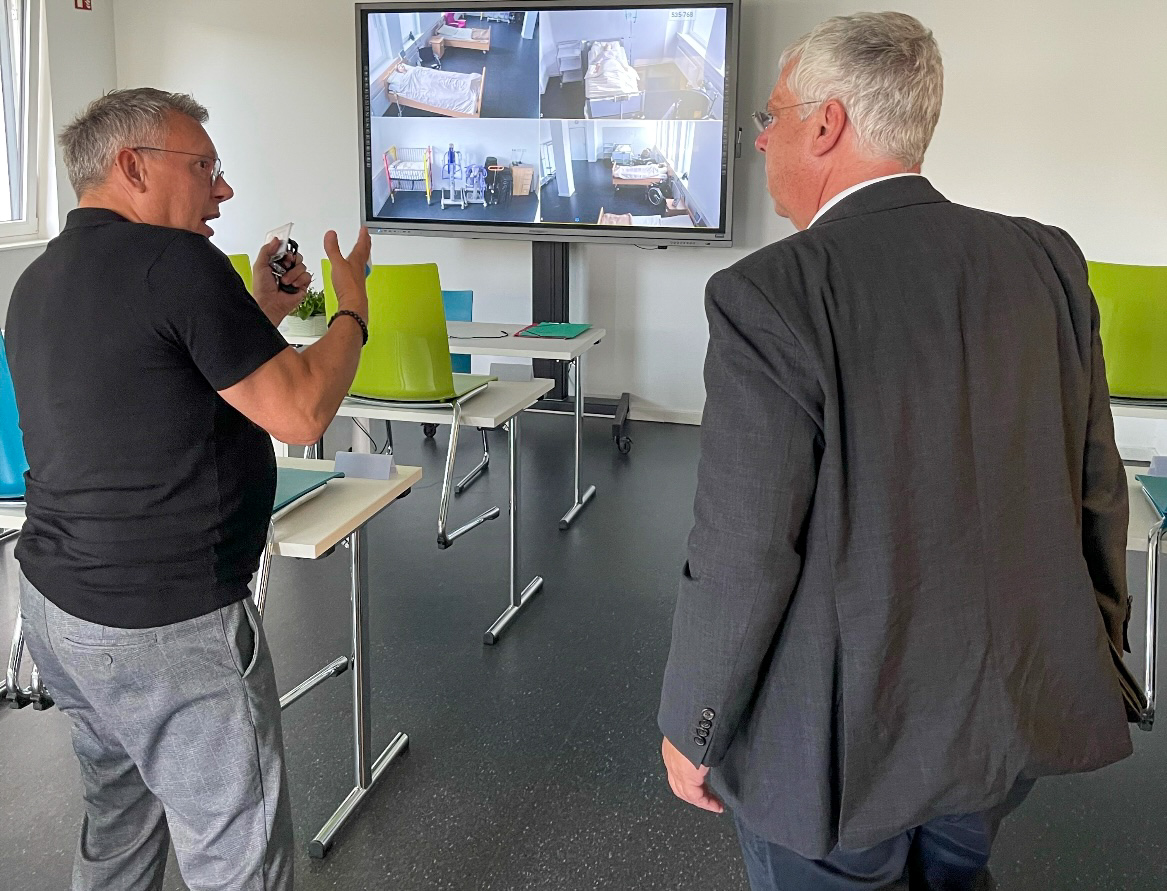 Stefan Leopold, Leiter der Diakonie Akademie erläuterte ganz praktisch den Schulalltag einer Pflegeschule. So bekam Jürgen Hardt mit Unterstützung weiterer Lehrkräfte einige Einblicke in die theorie-praxisverzahnten Lehr- und Lernmethoden in der beruflichen Pflegeausbildung. Der Erwerb beruflicher Handlungskompetenzen in einem modernen SkillsLab stand dabei im Fokus des Besuchs von Jürgen Hardt.