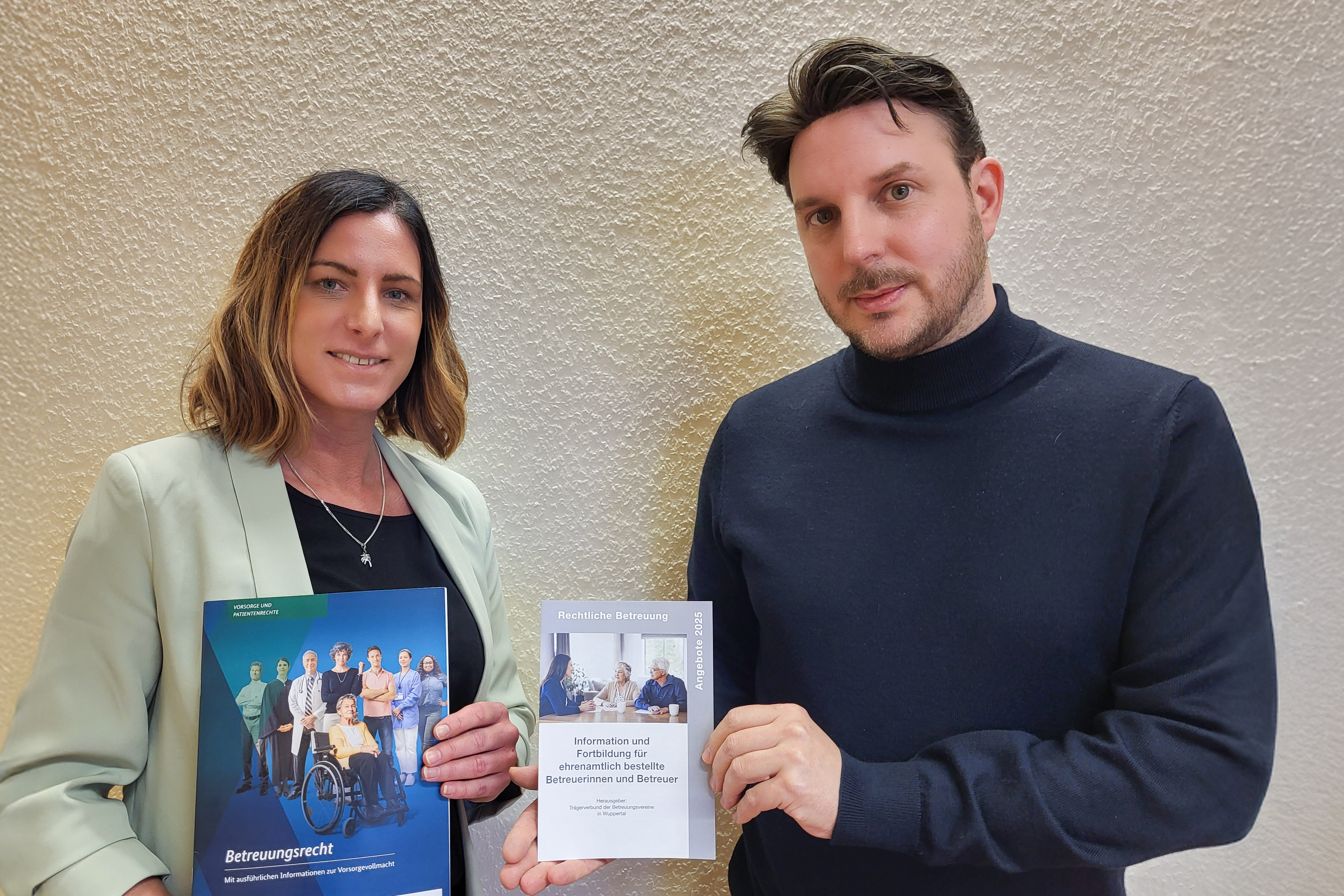 Sinja Ziegenhagen und Tim Querengaesser mit Infomaterial für Menschen, die Angehörige betreuen