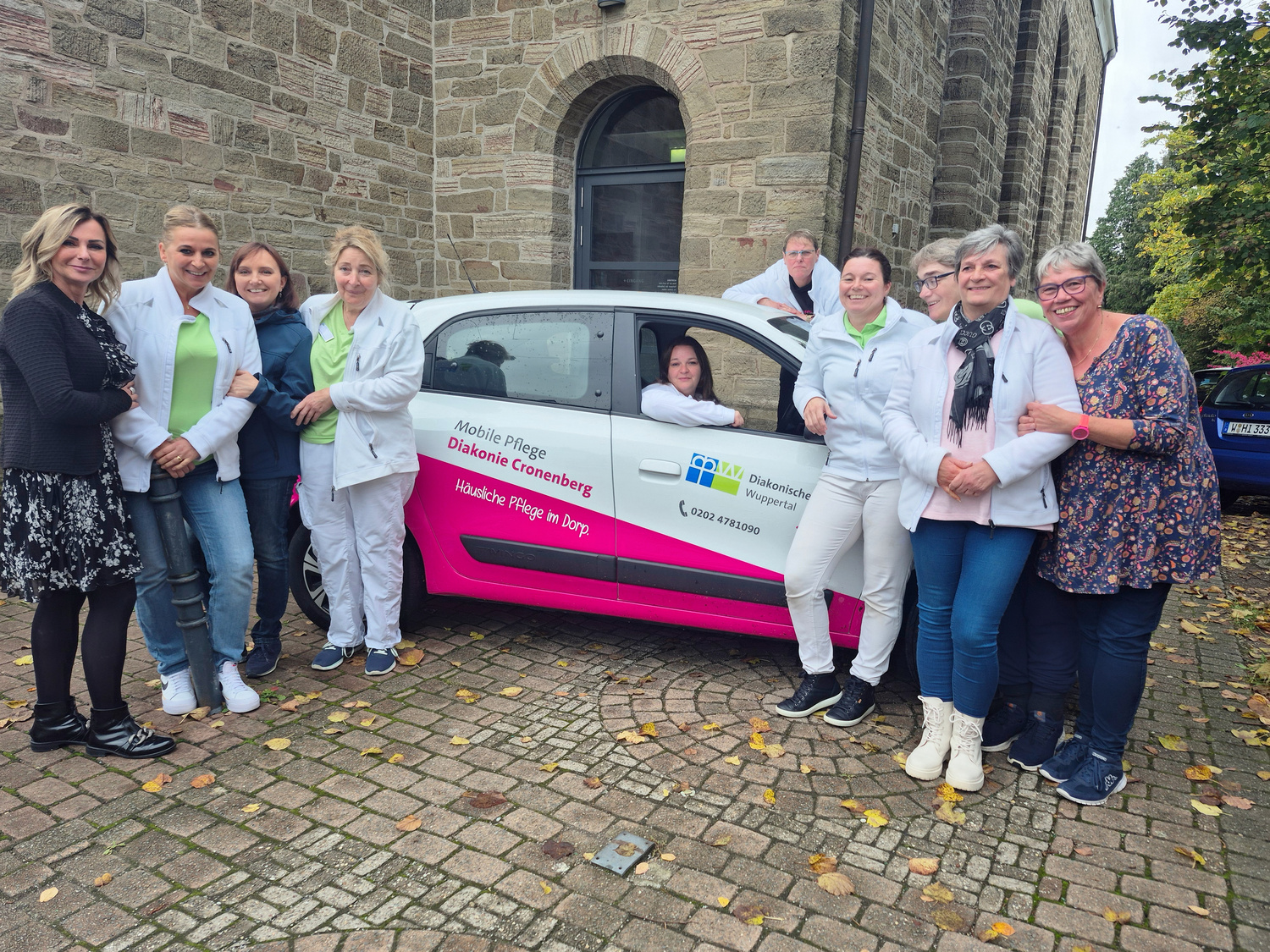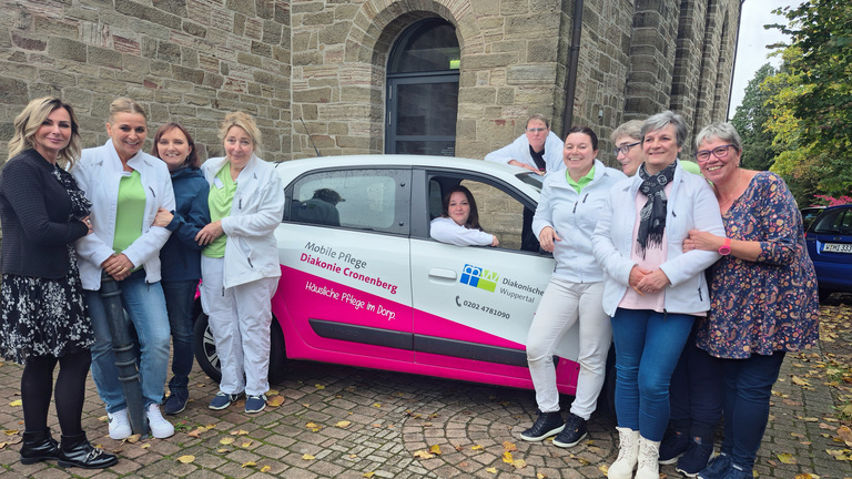 Mit ihren Kleinwagen in Weiß und Pink sind sie in Cronenberg sofort zu erkennen: Die Mitarbeiterinnen der Mobilen Pflege der Diakonie Cronenberg fahren mit einem neuen Logo im Wuppertaler Stadtteil zu ihren Kundinnen und Kunden. Seit Anfang des Jahres gehören die knapp 20 Pflege- und Hauswirtschaftskräfte der Diakonie Cronenberg zur großen Diakonischen Altenhilfe Wuppertal mit ihren rund 1.000 Mitarbeitenden. Sowohl für die ambulanten Pflegekräfte als auch für die Kundinnen und Kunden sei das eine spürbare Entlastung, betont die Leiterin der Mobilen Pflege, Anna Poplawski.